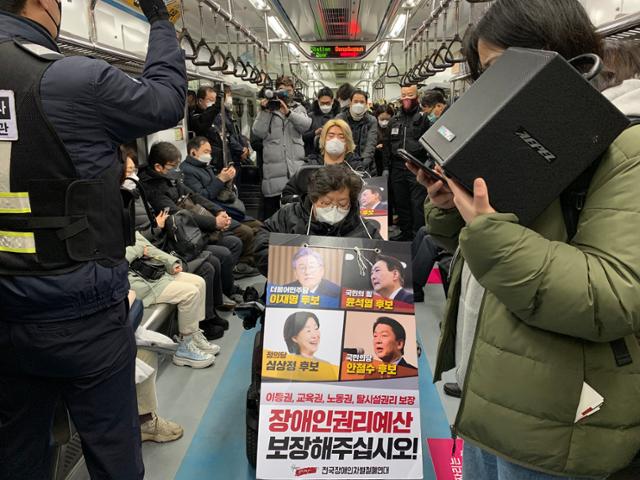 전국장애인차별철폐연대가 16일 서울 지하철 4호선에서 장애인 권리와 예산 확보를 요구하며 지하철 탑승 시위를 벌이고 있다. 정혜린 인턴기자