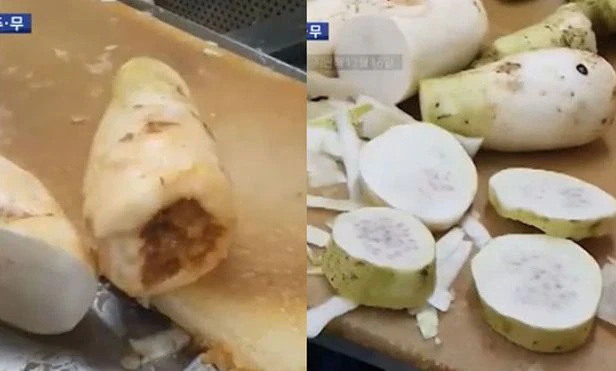 공익제보자가 유명 김치전문업체 자회사 공장에서 안쪽이 황토색으로 변하거나 단면에 보라색 반점이 나타난 무를 촬영한 모습 /MBC