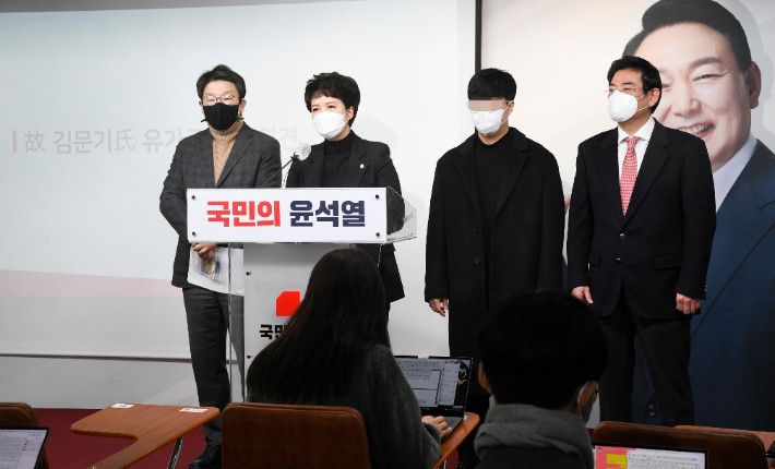 고 김문기 개발처장 장남 배석한 가운데 발언하는 김은혜 공보단장 (서울=연합뉴스) 하사헌 기자 = 국민의힘 권성동 의원과 김은혜 공보단장이 23일 서울 여의도 당사에서 ''고 김문기 성남도시개발공사 개발처장 유족''관련 기자회견을 열었다. 고 김문기 처장의 장남(오른쪽두번째)이 배석한 가운데 김은혜 공보단장이 발언을 하고 있다. 2022.2.23 [공동취재] toadboy@yna.co.kr (끝) 연합뉴스