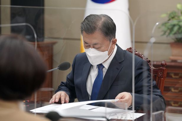 문재인 대통령이 25일 오전 청와대 여민관 소회의실에서 열린 글로벌 에너지 공급망 현안 점검회의에서 문승욱 산업통상자원부 장관으로부터 보고 받고 있다. /청와대 제공