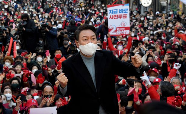 국민의힘 윤석열 대통령 후보가 27일 오후 포항시 북구 신흥동 거리유세에서 유권자들에게 지지 호소를 하고 있다. /이덕훈 기자