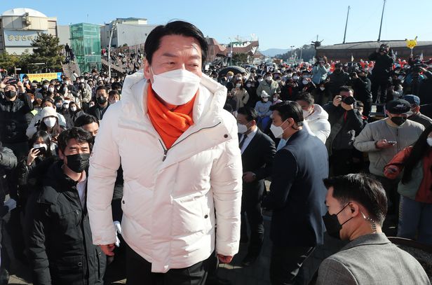 안철수 국민의당 대선후보가 2022년 2월 27일 오후 전남 여수시 이순신광장 앞에서 유세를 위해 연단으로 오르고 있다. /국회사진기자단