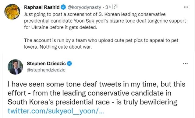 비판은 외신기자들 사이에서 더 두드러졌다. 영국 가디언 등에 한국 소식을 전하는 프리랜서 외신기자 라파엘 라시드는 윤 후보의 게시글을 공유한 뒤 "한국 보수정당 윤석열 대선후보의 기이하고도(bizarre), 눈치 없는(tone deaf) 귤 사진이 삭제되기 전에 올려둔다"며 "귀여운 반려동물 사진을 올리는 계정이다. (하지만) 전쟁에 귀여움은 없다(Nothing cute about war)"고 비판했다.