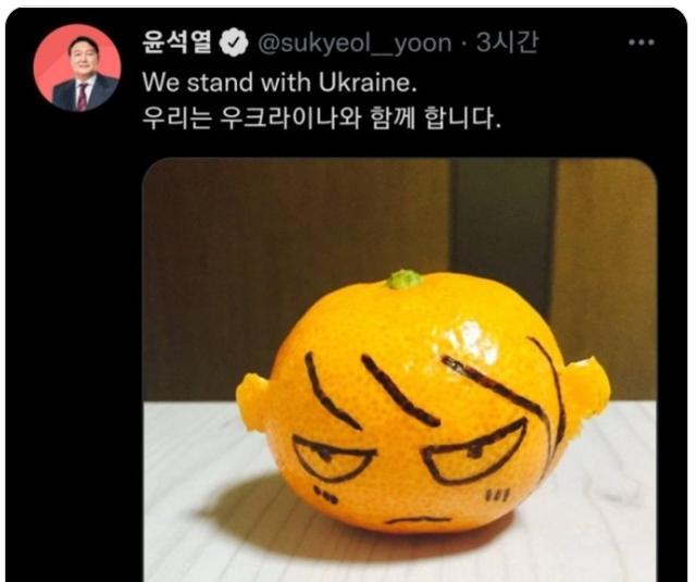 "우리는 우크라이나와 함께 합니다.(We stand with Ukraine)"라는 글과 함께 올라온 사진에는 펜으로 사람 얼굴을 그려 놓은 귤 사진이 첨부됐다. 귀 모양이 생기도록 껍질을 깐 귤에 올라간 눈꼬리, 일(一)자로 그은 입 모양, 앞머리까지. 잔뜩 화난 표정의 만화 캐릭터 같은 얼굴이 그려져 있었다.