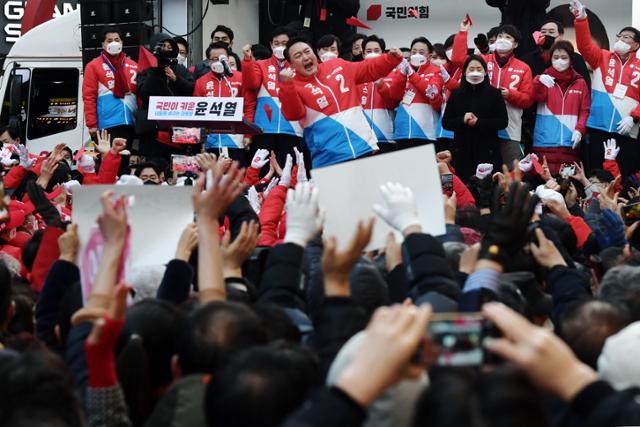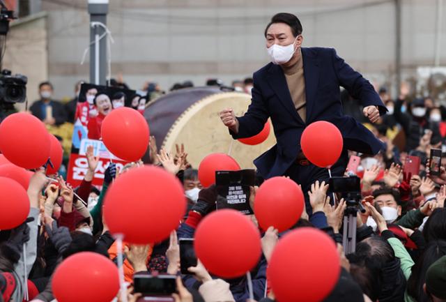 윤석열 국민의힘 대선후보가 2월 28일 강원 강릉시 중앙시장에서 열린 유세에서 '어퍼컷 세리머니'를 하며 주먹 쥔 손을 흔들고 있다. 강릉=오대근 기자