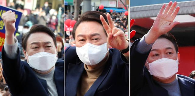 윤석열 후보가 2월 28일 강릉 유세 도중 손바닥을 펼쳐 보이며 지지자들의 연호에 답하고 있다. 강릉=오대근 기자