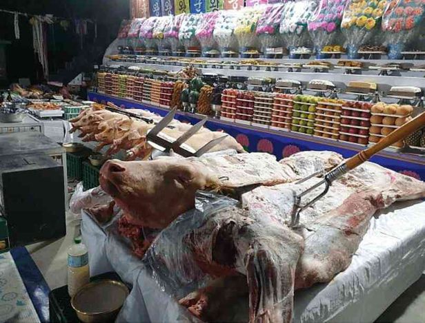 조선닷컴이 입수한 당시 행사 계획서에는 소 2마리, 돼지 15마리가 제물로 예정됐다. 사진상으로는 제단에 통째 삶은 소 1마리, 돼지 7마리만 보인다. 전통 종교계 관계자는 “통상 대형 굿에서 제물로 소 1마리가 올라가면 8000만원짜리 행사이고, 돼지가 1마리 추가될 때마다 500만~1000만원씩 제사비가 오른다”고 했다.