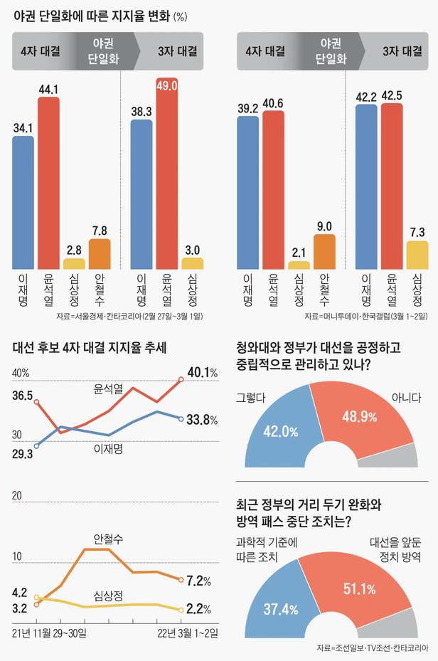 야권 단일화가 성사되기 직전인 1~2일 실시한 조선일보‧TV조선 조사에선 안 후보를 포함한 다자 대결 지지율이 윤 후보 40.1%, 이 후보 33.8%, 안 후보 7.2%, 심 후보 2.2%였다. 2월 23~24일 조사에선 윤 후보(36.5%)와 이 후보(34.9%)의 차이가 1.6%포인트였지만 6.3%포인트로 벌어졌다. 칸타코리아에 의뢰해 전국 유권자 1009명을 대상으로 휴대전화(89.9%)와 집전화(10.1%) 임의전화걸기(RDD)를 활용한 전화 면접원 방식으로 조사했다. 표본은 2022년 2월 말 행정안전부 주민등록인구 기준으로 성·연령·지역별로 할당 추출했으며, 인구 비례에 따른 가중치(셀 가중)를 부여했다. 표본오차는 95% 신뢰수준에 ±3.1%포인트, 응답률은 12.6%다. 기사에 인용된 자료는 중앙선거여론조사심의위원회 참조