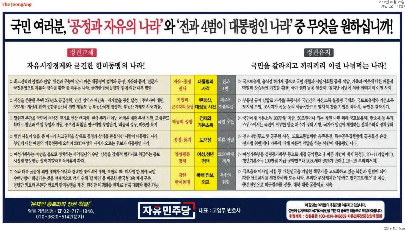 자유민주당 대표는 과거 “문재인은 공산주의자”라고 주장했던 고영주 변호사다. 해당 의견광고에는 “문재인 종북좌파 정권 척결!”과 같은 구호도 담겼다.