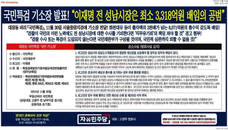 앞서 중앙일보는 지난해 12월1일자 35면에 “국민특검 기소장 발표! 이재명 전 성남시장은 최소 3318억원 배임의 공범”이란 제목의 자유민주당 의견광고를 실었다. 자유민주당 대표는 과거 “문재인은 공산주의자”라고 주장했던 고영주 변호사다. 해당 의견광고에는 “문재인 종북좌파 정권 척결!”과 같은 구호도 담겼다.