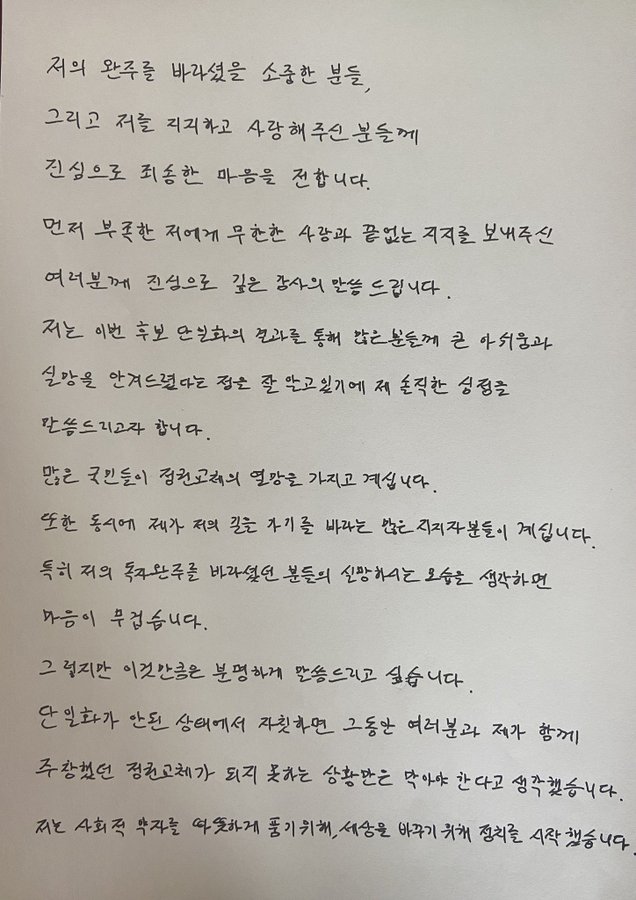 저를 지지해주시고 사랑해주신 분들이 꿈꾸는 나라, 더 좋은 대한민국을 만드는 일을 결코 포기하지 않겠습니다.