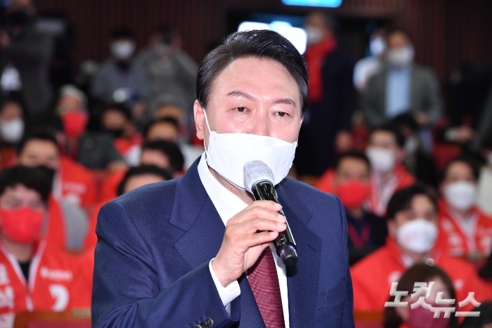 윤석열 대통령 당선인이 10일 새벽 서울 여의도 국회도서관에 마련된 '국민의힘 제 20대 대통령선거 개표상황실'을 찾아 당선소감을 말하고 있다. 윤창원 기자