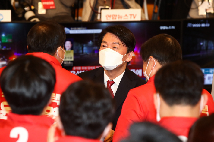 국민의힘 의원들과 인사하는 안철수 대표 (서울=연합뉴스) 백승렬 기자 = 국민의당 안철수 대표가 10일 새벽 국회 도서관에 마련된 국민의힘 제20대 대통령 선거 개표상황실을 방문해 국민의힘 의원들과 인사하고 있다. 2022.3.10 [국회사진기자단] srbaek@yna.co.kr (끝) 연합뉴스
