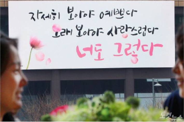 ◆ 김경진> 교보문구 위에 플래카드로 긴 시간 동안 붙어 있었습니다. 사실은 나태주 시인님께서 썼다는 건 전혀 모르고 있었고 저렇게 참 소박하고 아름다운 글귀가 있을까 하는 생각을 종로 광화문 지나갈 때마다 했었거든요. 직접 쓰신 시인이구나.