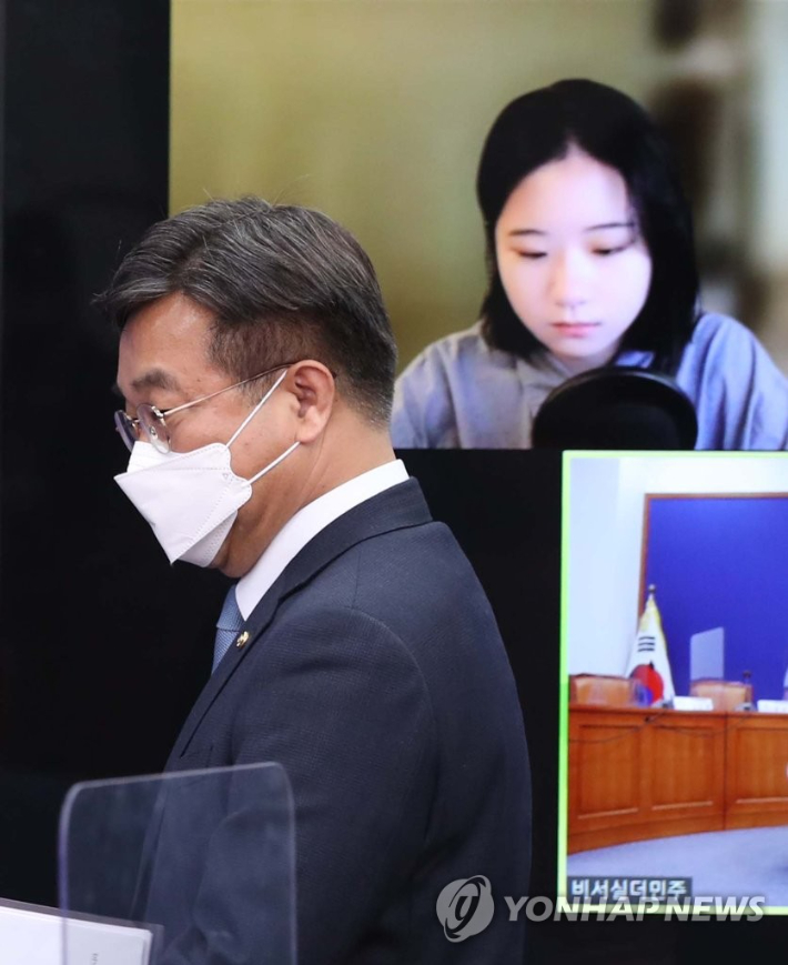 더불어민주당 박지현 공동비대위원장이 14일 오전 국회에서 열린 비상대책위원회의에서 줌(ZOOM)을 통해 모두발언 하고 있다. 황진환 기자