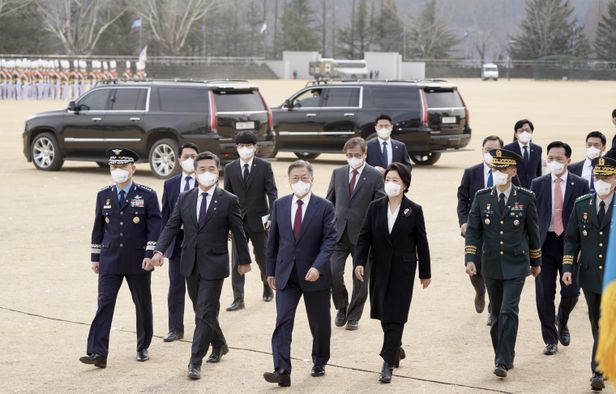 문재인 대통령과 김정숙 여사가 2월 28일 경북 영천시 육군3사관학교에서 열린 제57기 졸업 및 임관식에 참석하고 있다. /뉴스1