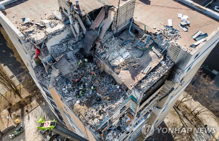 (키이우 AFP=연합뉴스) 17일(현지시간) 우크라이나 수도 키이우(키예프)의 한 아파트가 추락한 로켓의 파편에 맞아 크게 파손된 모습.러시아군은 키이우를 점령하기 위해 주거지역을 가리지 않고 무차별 공격을 퍼부어 사상자와 민간 시설 피해가 급증하고 있다. 2022.3.17 leekm@yna.co.kr 연합뉴스