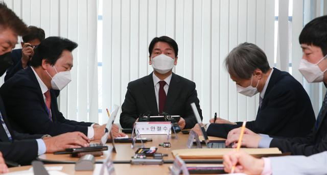 안철수 인수위원장이 21일 서울 종로구 통의동 인수위 회의실에서 열린 코로나19비상대응특별위원회 제1차 회의에서 발언하고 있다. 연합뉴스