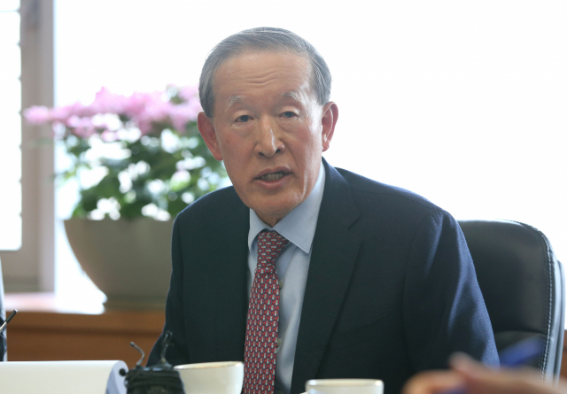 허창수 전경련 회장이 21일 서울 종로구 통의동 대통령직 인수위원회 사무실에서 열린 윤석열 대통령 당선인의 경제 6단체장 오찬 회동에 참석해 자리에 앉아 있다. 연합뉴스