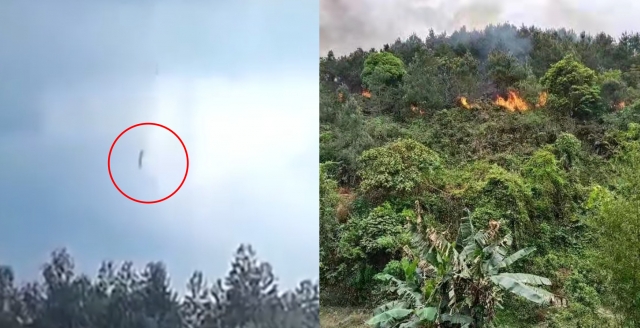 중국 동방항공 여객기가 21일 중국 광시장족 자치구에 추락하는 모습(왼쪽 사진)과 추락 지역에 산불이 나고 있다. 트위터 캡처, 신화 연합뉴스