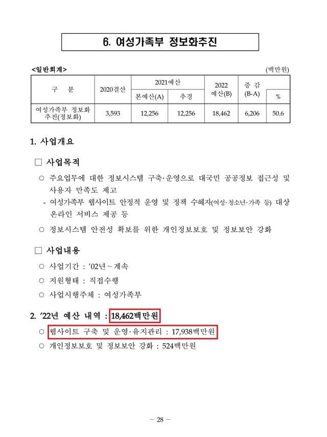 여가부의 정보화 추진사업은 2002년부터 시행됐다. 최근 관련 예산 내역을 살펴보면, 웹사이트 구축 및 운영·유지관리에는 ▲2019년 36억3500만원 ▲2020년 33억1500만원 ▲2021년 35억1200만원이 편성됐다. 개인정보 보호 및 정보 보안 강화에는 ▲2019년 2억3500만원 ▲2020년 4억5000만원 ▲2021년 3억6800만원이 쓰였다.