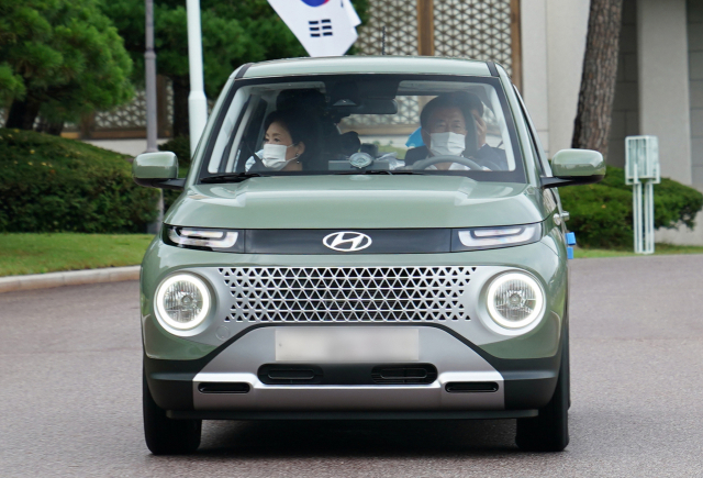문재인 대통령이 김정숙 여사와 6일 청와대 경내에서 '광주형 일자리'를 통해 생산된 경형 SUV 캐스퍼를 인수하고 시운전을 하고 있다. 연합뉴스