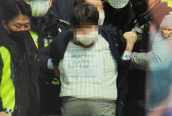 주변에 있던 경찰이 곧바로 그를 제압했다. 체포 당시 이 남성은 ‘HR_인민혁명당 가입해주세요! *^^* 사법살인진실규명연대’라는 문구가 적힌 종이를 자신의 옷에 부착한 모습이었다.