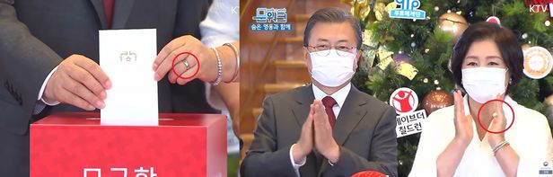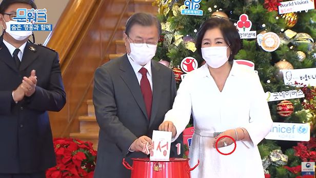 문화체육관광부 산하 한국정책방송원(KTV) 유튜브 영상을 보면 당시 김정숙 여사는 알이 큰 진주 반지를 끼고 있었다. 하지만 성금봉투를 넣을 땐 알이 없는 반지를 끼고 있다.