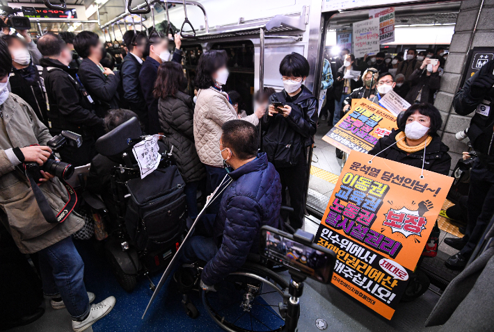 전국장애인차별철폐연대(전장연) 회원들이 28일 서울 종로구 경복궁역 3호선에서 장애인 이동권 보장·장애인 권리예산 반영을 요구하기 위해 열린 지하철 시위 '출근길 지하철 탑니다'를 위해 탑승하고 있다. 연합뉴스