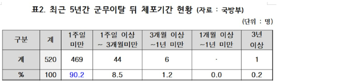 2017년부터 21년 8월까지 군무이탈자, 그러니까 탈영병이 총 521명인데요. 조사 기간 동안 계속 줄어들고 있어요. 그렇죠? 다행인데 병사도 있고 간부도 있습니다. 검거율을 보죠. 검거율. 거의 100%입니다. 521명 중에 1명 뺀 520명 체포했습니다. 게다가 그중에 90% 이상은 일주일 만에 체포되고요. 또 8.5%는 3개월 안에 체포돼요. 대부분 3개월 안에 잡는다는 거죠.
