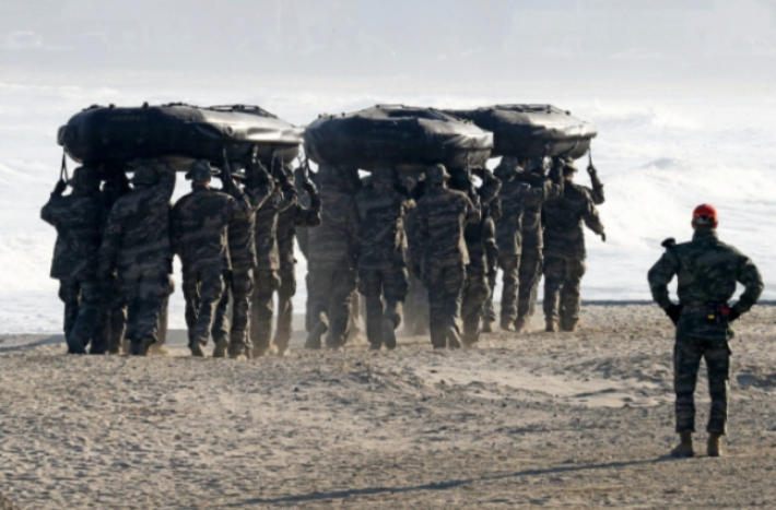 지난 1월 20일 경북 포항시 남구 한 해안에서 해병대 신병들이 소형고무보트(IBS) 훈련을 하고 있다. 기사 내용과 직접적인 관련 없음. [사진= 연합뉴스]