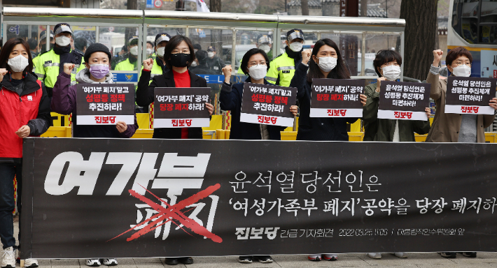 여가부 폐지 공약 철회 촉구 (서울=연합뉴스) 홍해인 기자 = 진보당 6·1 지방선거 기초의원 예비 후보와 당원들이 25일 대통령 당선인 집무실이 있는 서울 종로구 통의동 금융감독원 연수원 앞에서 당선인의 '여성가족부 폐지' 공약 폐지를 촉구하는 기자회견을 하고 있다. 2022.3.25 hihong@yna.co.kr (끝) 연합뉴스
