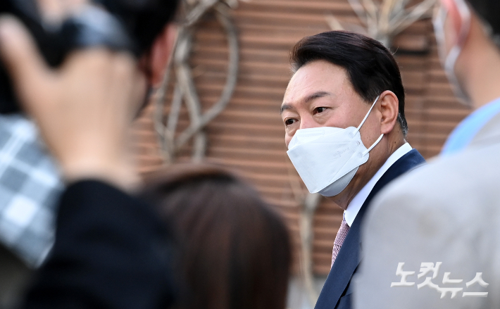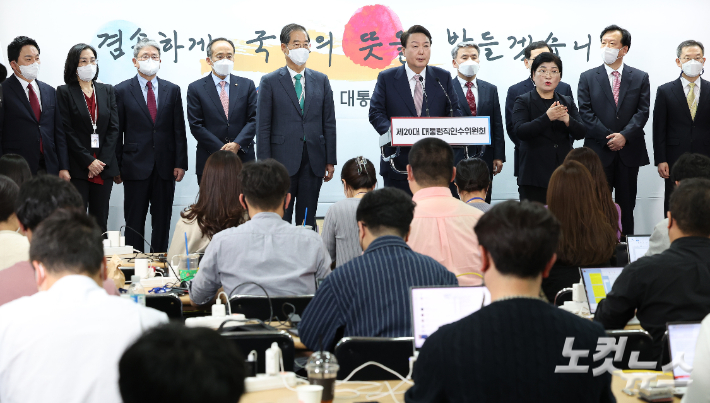 윤석열 대통령 당선인이 10일 서울 종로구 통의동 금융감독원 연수원에 마련된 대통령직인수위원회에서 내각 인선 발표를 마친 후 인수위 사무실을 나서며 취재진의 질의에 답하고 있다. 인수위사진기자단