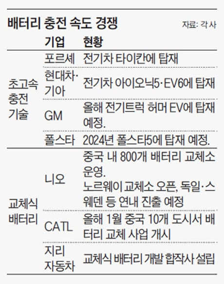 현대차·포르셰·GM 등 한국·유럽·미국 제조사들은 800V 고전압 충전을 통한 초고속 충전기술 개발에 열을 올리고 있다. 반면 니오·지리자동차 등 중국 업체들은 교체식 배터리 기술 개발과 인프라 구축에 힘쓰고 있다. 긴 시간 배터리를 충전하는 대신 아예 미리 충전된 배터리로 갈아끼는 방식을 택한 것이다.