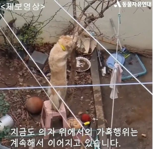 앞서 동물자유연대는 지난 11일 이 리트리버가 목줄에 묶인 채 플라스틱 의자 위에 두 발로 올라서 벌서는 모습이 담긴 영상을 공개했다. 리트리버는 뒷발로 의자를 밟고 앞발을 나무에 기대, 간신히 서 있었다.