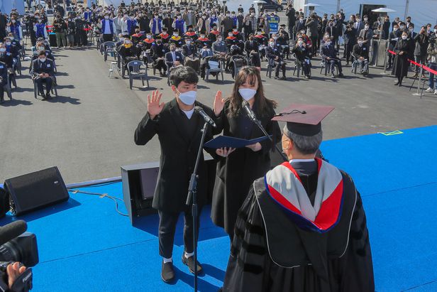 지난달 2일 오전 전남 나주 한전공대 입학식에서 학생 대표가 선서하고 있다. 올해에만 정부 예산 290억원이 들어가는 학교다. /연합뉴스