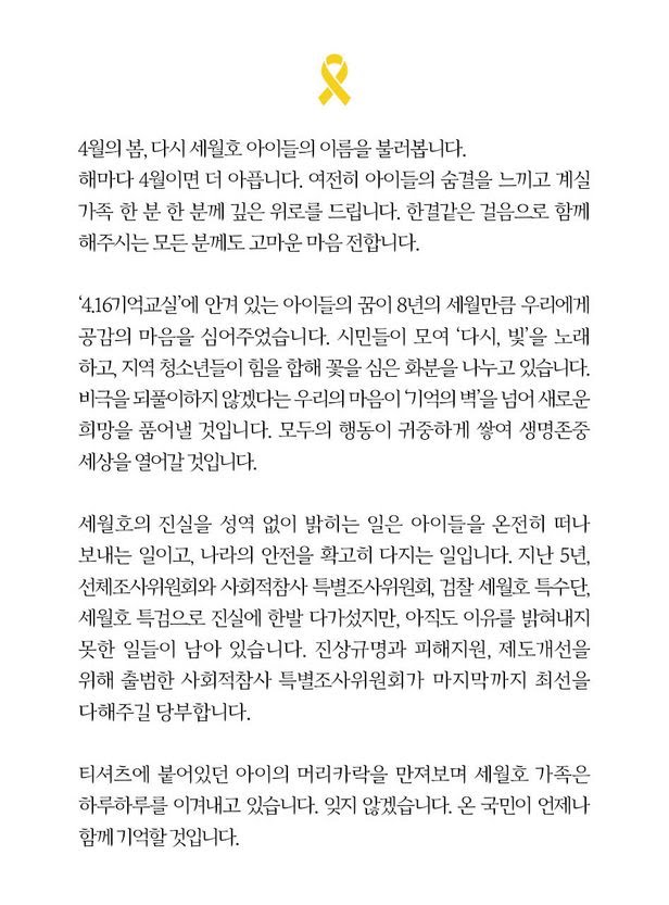 문 대통령은 “4월의 봄, 다시 세월호 아이들의 이름을 불러본다”며 “해마다 4월이면 더 아프다. 여전히 아이들의 숨결을 느끼고 계실 가족 한 분 한 분께 깊은 위로를 드린다”고 했다.