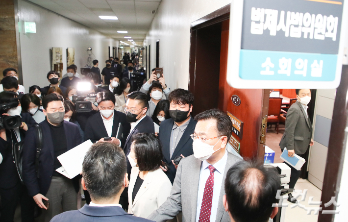 18일 국회에서 열린 법제사법위원회 소위를 앞두고 유상범 전주혜의원등 국민의 힘 의원들이 국회 경위들에게 소위 공개를 주장 하고 있다. 국회 법사위 법안심사 제1소위 위원장 박주민 의원은 이날 오후 7시 '검수완박'이라고 불리우는 검찰청법 및 형사소송법 개정안 등을 논의하기 위한 소위를 소집했다. 윤창원 기자