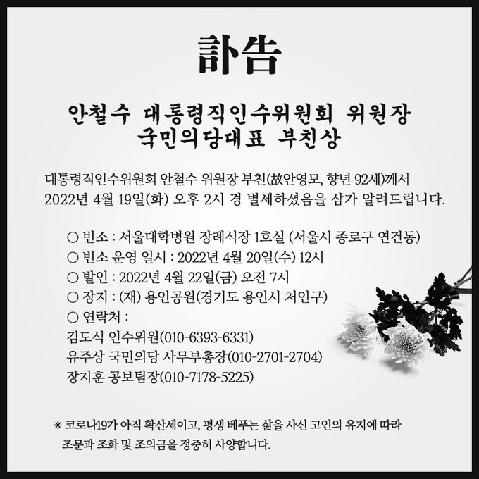 안철수 대통령직인수위원회 위원장 국민의당대표의 부친상이 알려졌다.
