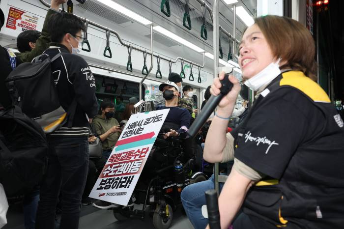 장애인 단체가 출근길 지하철 탑승 시위를 재개했다. 대통령인수위원회의 책임있는 답변을 기다리겠다며 지난달 30일 잠정 중단한 지 22일 만이다. 서울교통공사는 교통약자 이동권 보장을 위한 노력을 다하고 있다며 출근길 시위를 자제해줄 것을 요청했다.