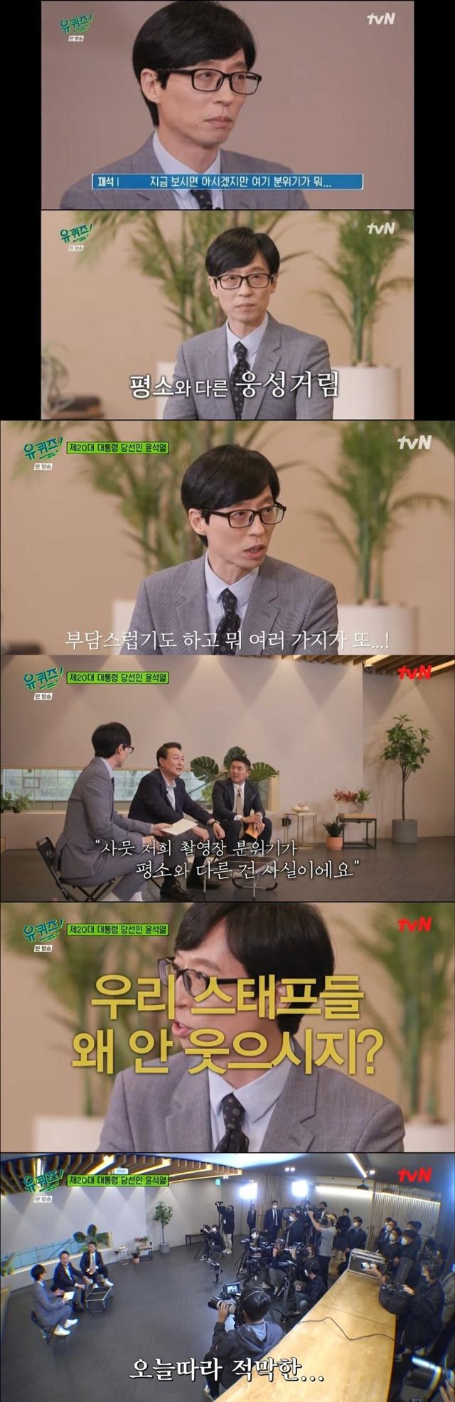 윤석열 유퀴즈 출연에 민폐 VS 편집 지나치게 밋밋 출연 부정적 누리꾼들 진행자 유재석 경직된 표정 공유 유퀴즈에 이익 1도 없어 안티만 양성 제작진이 노잼 편집 어쨌든 잘봤다