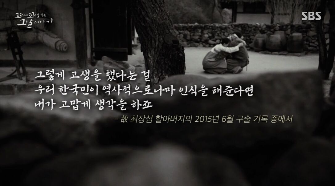 최장섭 할아버지는 생전에 항상 하시던 말씀이 있었대. "다시는 우리 후대 자손들에게 이런 일이 있어서는 안된다. 역사는 옳게 써야한다. 오직 눈물로써 우리 후손들에게 바라는 것은 역사를 올바르게 잡아달라는 것이다. 그것이 나의 마지막 소원이다."