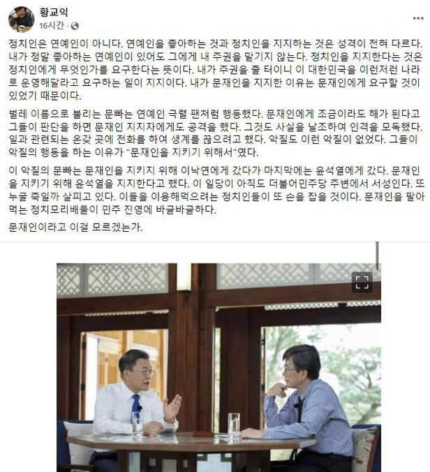 맛 칼럼니스트 황교익씨도 같은 주장을 펼쳤다. 그는 23일 페이스북에 “문빠(문 대통령 지지자)는 문재인을 지키기 위해 이낙연에게 갔다가 윤석열에게 갔다. 문재인을 지키기 위해 윤석열을 지지한다고 했다. 이 일당이 아직도 민주당 주변에서 서성인다”며 “이들을 이용해먹으려는 정치인들이 또 손을 잡을 것. 문재인을 팔아먹는 정치모리배들이 민주 진영에 바글바글하다. 문재인이라고 이걸 모르겠는가”라고 했다.