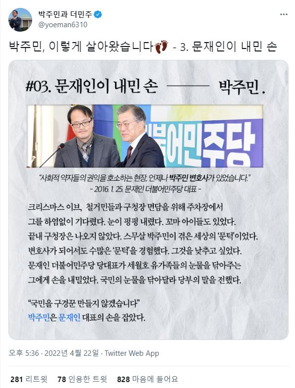박 의원은 22일 트위터에 2016년 문 대통령과 찍은 사진을 올린 뒤 “박주민, 이렇게 살아왔습니다. 문재인이 내민 손”이라고 적었다. 이를 본 네티즌들은 답글에 문 대통령의 ‘선거용이죠 뭐’ 대담 예고 영상을 캡처해 올리며 “대통령 이야기는 하지 마시라”, “이재명 지지하다 선거 때만 문프팔이”, “아쉬울 때마다 문프 찾기”라며 비난했다.