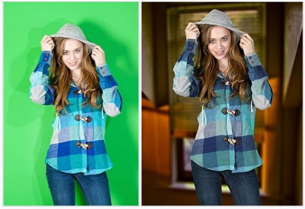 방송에 주로 쓰이는 크로마키. 푸른색이나 녹색 스크린 앞에서 먼저 동작을 촬영한 뒤(왼쪽) 그 배경색 부분에 뉴스 관련된 동영상을 합성한다(오른쪽)./위키피디아