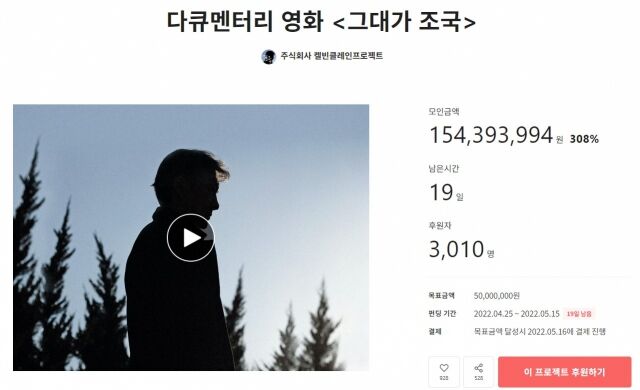 '그대가 조국' 펀딩, 하루만에 1억 5천 돌파 관객들의 지지 증명 5월 25일 극장 개봉 예정 모금 시작 하루 만 목표치 세 배 달성 당초 목표액 5,000만원 시사회 대관비 포토북 DVD제작비용
