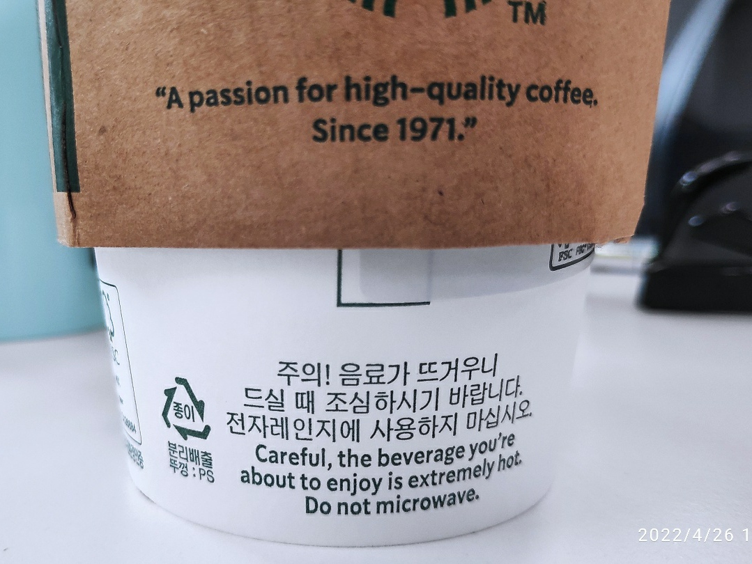 오늘 마신 커피에도 주의 표시가 잘되어있다. 하지만 좀 뜨거웠다. 참는다. 어디다 말할 여유가 없다. ㅋㅋ