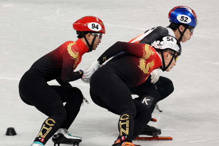 황대헌이 7일 중국 베이징 캐피털 인도어 스타디움에서 열린 쇼트트랙 남자 1000m 준결승전에서 중국 런쯔웨이와 리원룽의 견제를 받으며 역주하고 있다. 베이징(중국)=박종민 기자