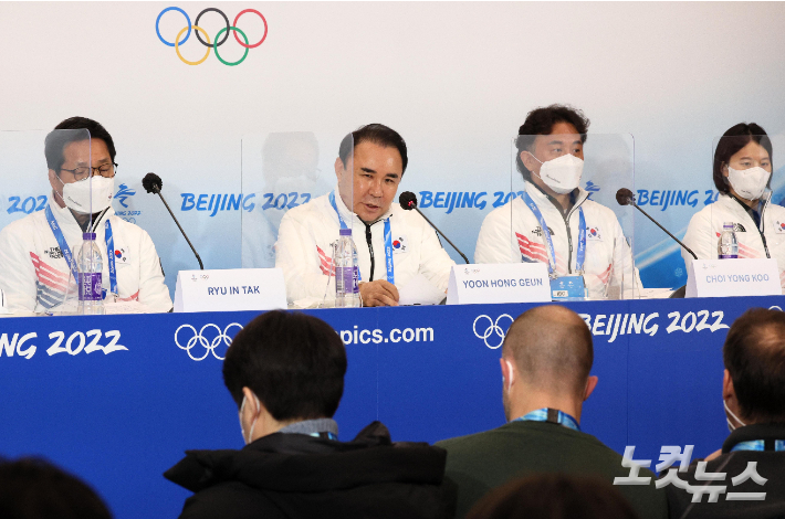 지난 2월 8일 중국 2022 베이징동계올림픽 메인미디어센터에서 열린 쇼트트랙 편파판정에 대한 선수단장 긴급 기자회견. 왼쪽부터 류인탁 선수부단장, 윤 단장, 최용구 쇼트트랙 대표팀 지원단장, 이소희 쇼트트랙 대표팀 코치 겸 비디오 전력분석 담당 베이징(중국)=박종민 기자