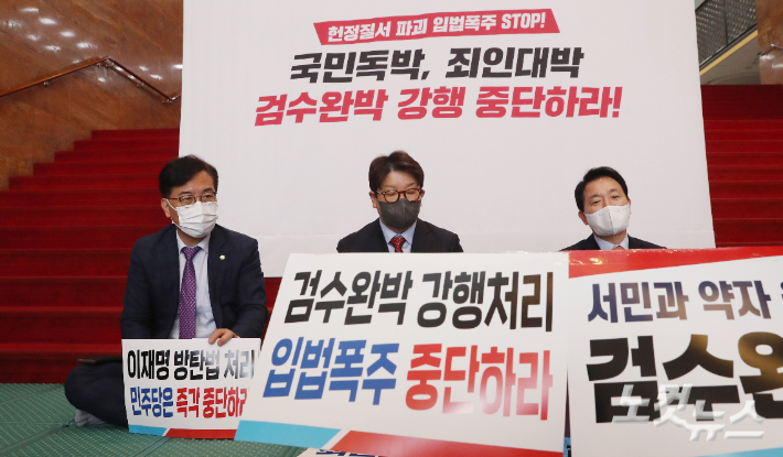 국민의힘 권성동 원내대표(가운데)가 27일 오전 서울 여의도 국회 로텐더홀 입구에서 검찰 수사권 기소권 분리 법안 강행처리 저지를 위한 연좌농성에 돌입하고 있다. 왼쪽부터 송언석 원내수석부대표, 권 원내대표, 성일종 정책위의장. 윤창원 기자